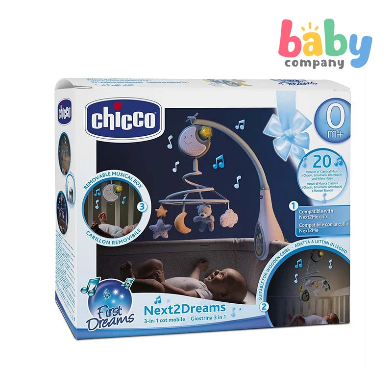 The 3in1 next2dream cot mobile is the first fully compatible cot mobile suitable for Chicco’s next2me range. complete with 4 soft fabric pendants, a gentle nightlight feature, and 15 minutes of soothing sounds to send your little one to sleep each night. Let the soothing sounds follow you on every journey, thanks to its unique removable electronic panel that can be attached to your stroller. suitable from 0m+.
