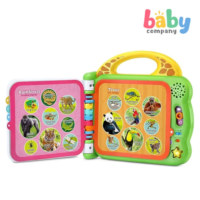 Hold 200+ words in your hands with the touch-sensitive pages of the 100 Words and 100 Animals Book Set! Kids have a natural curiosity about the world, and these books provide lots of opportunities for exploration with illustrations and photographs of animals, objects and concepts. Six double-sided, interactive pages in each book feature vocabulary about 12 animal habitats and environments in the 100 Animals Book and 12 categories of words in the 100 Words Book, like colors, foods, activities, opposites, outdoors and more. Touch the pictures to hear sound effects or press the light-up star summary to hear learning songs. Immerse your toddler or preschooler in bilingual play by sliding the language switch to hear the words, songs and instructions in English or Spanish. Discover 200+ new words! Intended for ages 18+ months. Requires 4 AA batteries. Batteries included for demo purposes only. New batteries recommended for regular use. Recommended for: Ages 18 months – 4 years