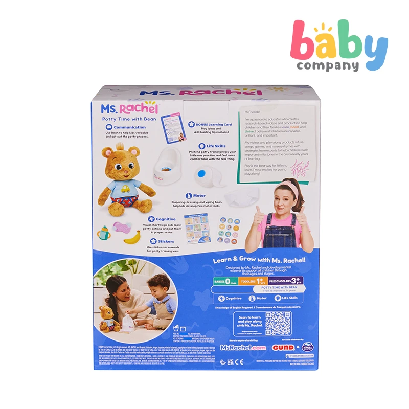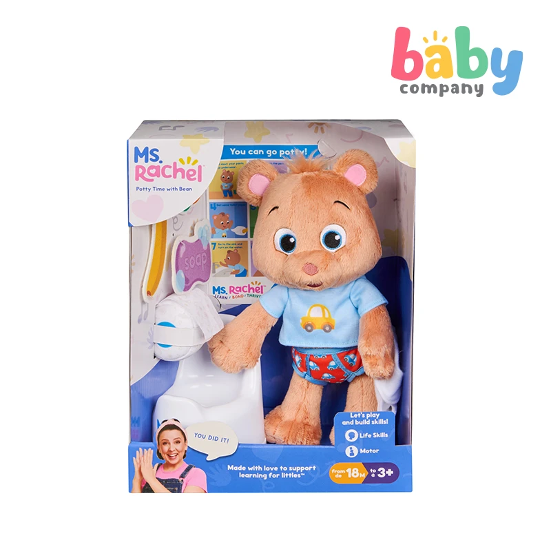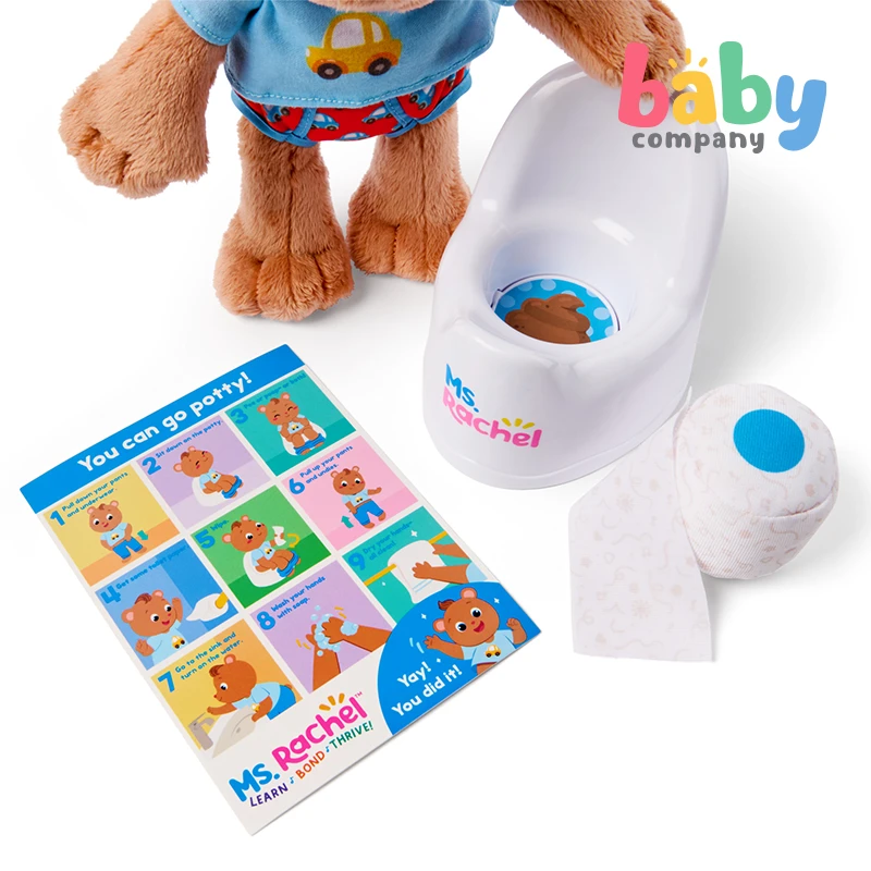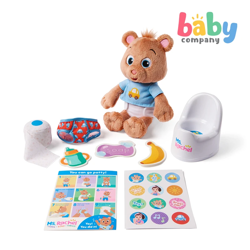 Make potty training fun, approachable, and interactive with the Ms. Rachel Potty Time with Bean set! Join Ms. Rachel’s friend Bean, an adorable teddy bear plush, as he learns potty skills using his own play toilet with reversible flap for #1 and #2. The set includes play toilet paper, a detachable diaper, and felt accessories like a banana, sippy cup, and soap to encourage fine motor skill development. The visual chart guides little ones through potty steps, and comes with an included sticker sheet. Plus, the bonus learning card offers helpful tips and activities to keep learning fun and engaging! This 100% BPA-free toy is designed by Ms. Rachel and developmental experts to support all children, through their ages and stages, from 18+ months. These are ideal newborn toys, toddler toys, preschool toys, and toys for ages 2-4. From baby shower gifts to baby essentials, these products help families learn, bond, and thrive. Ms. Rachel is a real teacher and passionate educator, with two master’s degrees in education. She and her team create research-based videos and products to support learning for littles.