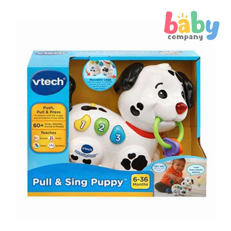 Pull Along Puppy includes phrases, sounds, three sing-along songs, and 20 melodies. teaches colors, numbers, and cause and effect. develops motor skills. Legs really move!