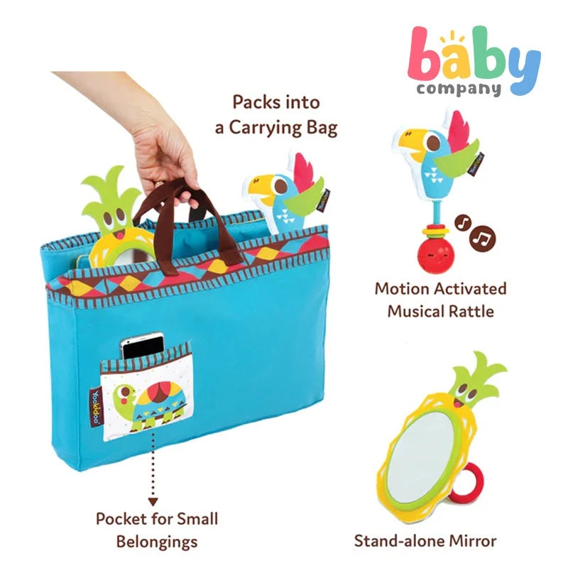 Playmat folds to become a carrying bag. For indoor and outdoor. Extra Large playmat enables baby to move around, roll over and explore their surroundings, extending essential tummy time. Trendy illustrations with strong color contrasts stimulate baby’s visual development and cognitive skills. Mirror encourages repeated head lifting and develops neck and shoulder muscles which are essential for baby’s development.